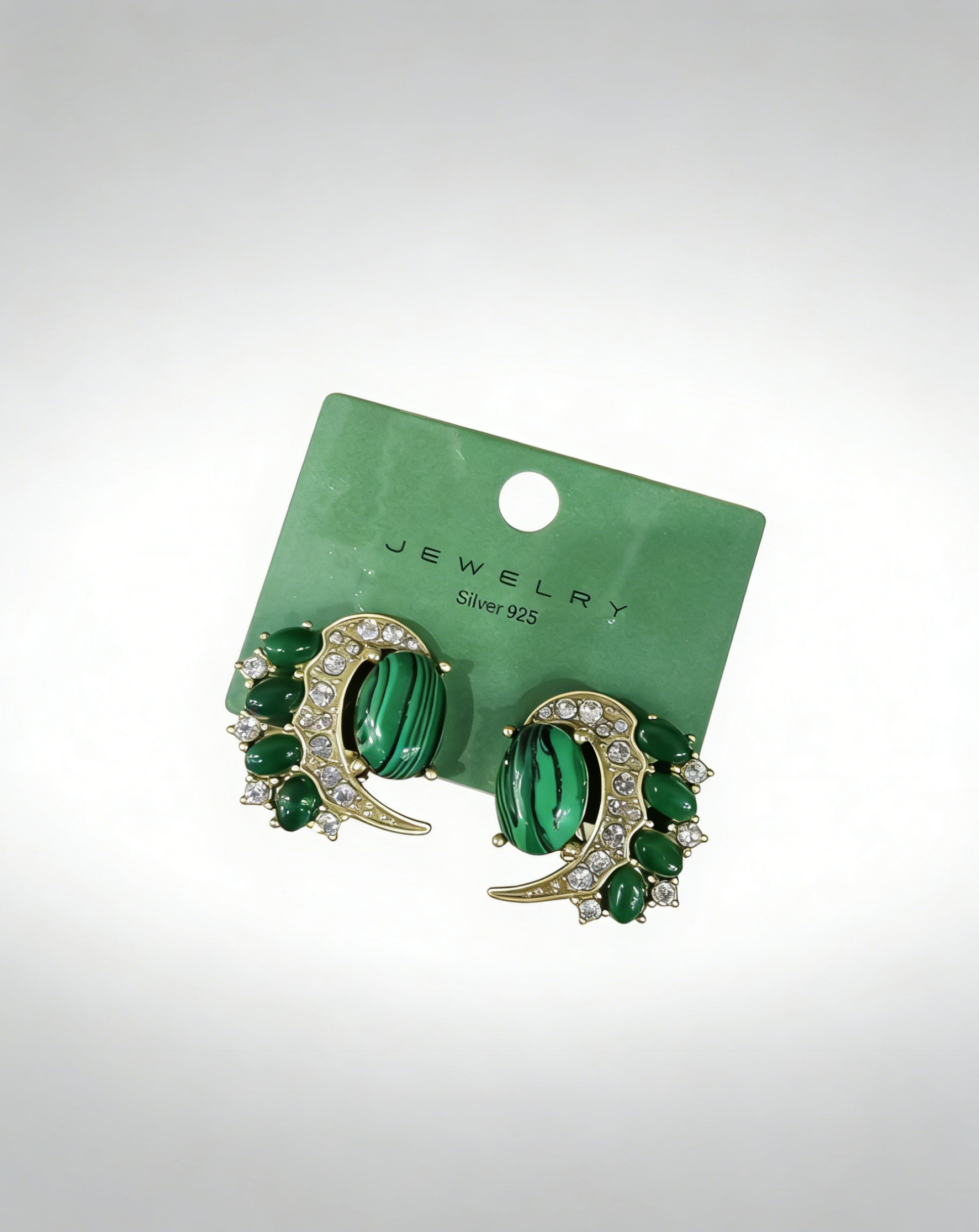 These striking stud earrings feature a bold crescent-shaped design, centered by a large oval green accent with natural striped patterns. The crescent frame is lined with smaller oval green accents and sparkling details, creating a lush, nature-inspired look that adds a touch of vintage elegance to both casual and formal outfits.