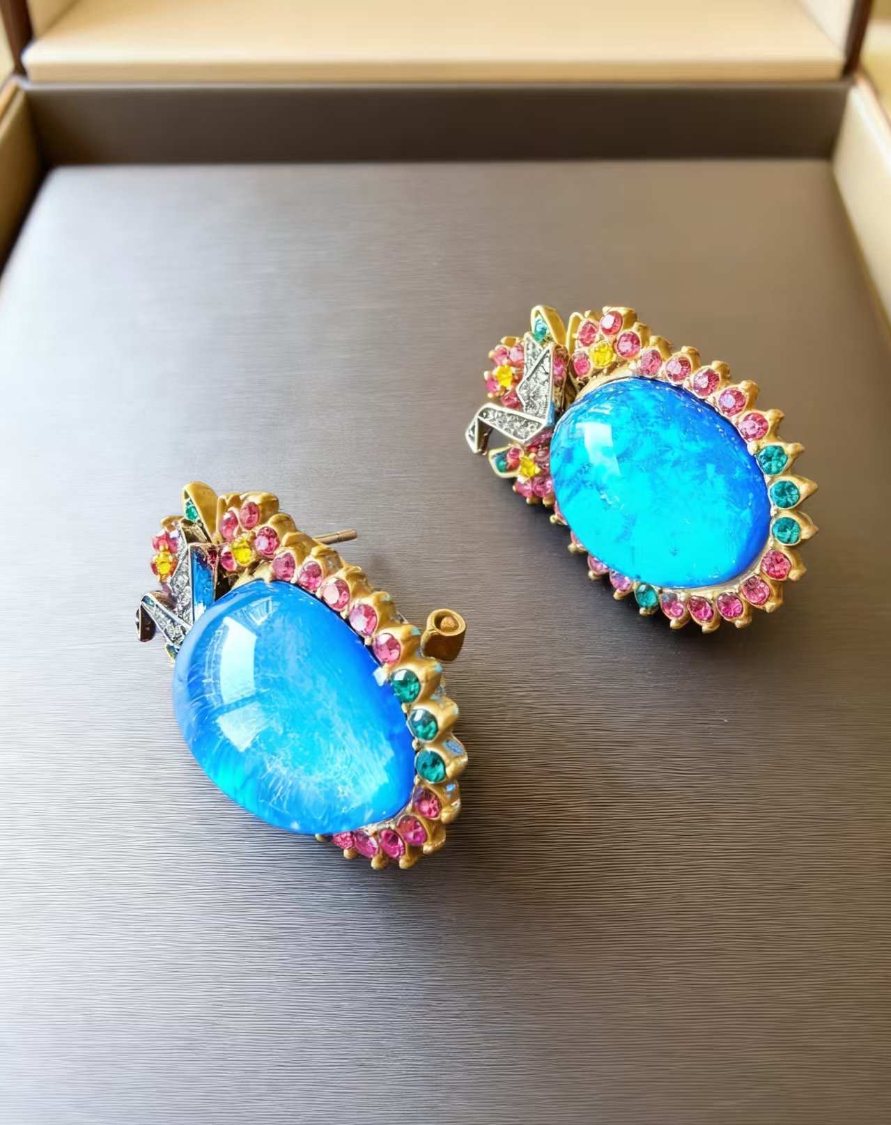 This ring takes a 3D floral shape as the core design, with petals made of blue-red gradient enamel, a bright ruby in the center, and a diamond-studded border. The silver-toned metal base highlights the color layering; the overall style combines palace luxury and retro exquisiteness, with a full flower shape and vivid details. It’s suitable for dinners, retro outfits and other scenes, and is an eye-catching personalized jewelry piece.