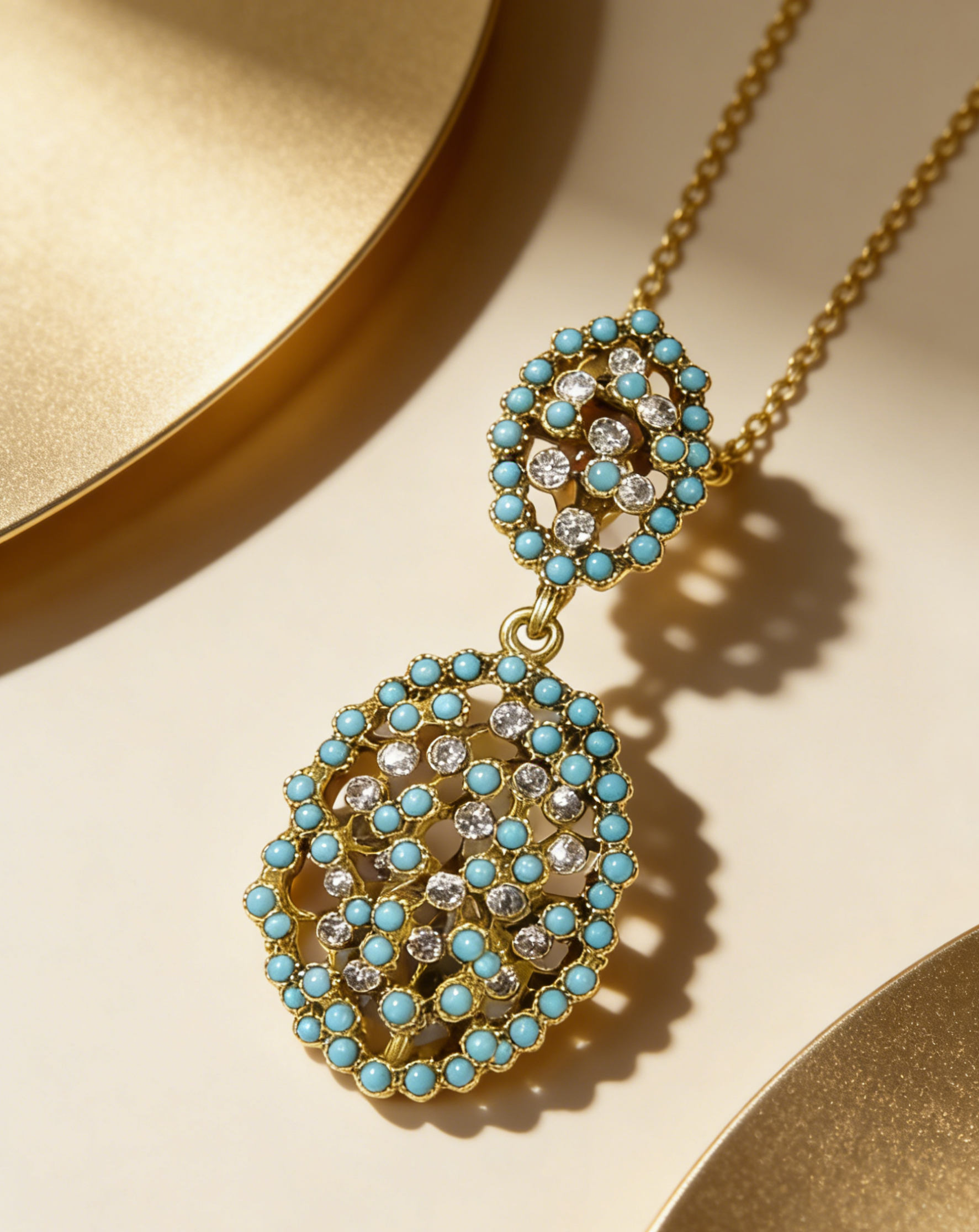 These eye-catching drop earrings boast a two-part design. The upper cluster is a delicate arrangement of shimmering stones, while the lower oval pendant is densely adorned with a captivating pattern of pastel-hued beads and sparkling accents. This elegant piece is perfect for elevating formal attire or adding a touch of luxury to special occasions.