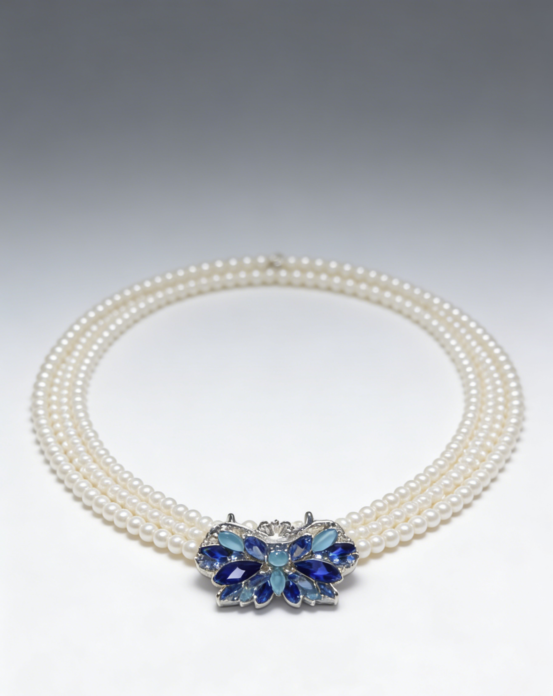 This elegant necklace features a symmetrical design with round, fluted green accents at its core, interspersed with ornate floral motifs adorned with small pearl-like drops. The design culminates in a teardrop-shaped green pendant at the bottom, exuding a refined, old-world charm that is perfect for formal occasions or sophisticated everyday wear.